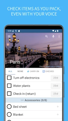 🎤 Use your voice to interact with the app while it tells you what to pack next. Just reply with "ok", "yes" or "check" to cross out the current item and proceed to the next
