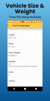 • Configure the app to reflect the size and weight of your vehicle to ensure the best route. The default settings are set up for an 18 wheeler: 80,000 lbs, 53' length, 13'6" height, 8' 6" width. You can easily change these settings to be higher or lower to accommodate your vehicle size or Hazmat Level. Also supports motor coaches.