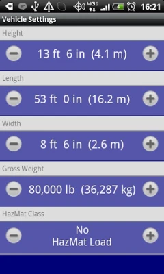 • Configure the app to reflect the size and weight of your vehicle to insure the best route. The default settings are set up for an 18 wheeler: 80,000 lbs, 53' length, 13'6" height, 8' 6" width. You can easily change these settings to be higher or lower to accommodate your vehicle size or Hazmat Level. Also supports motor coaches.