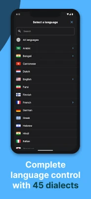 Arabic, Bengali, Cantonese, Dutch, English, Farsi, Finnish, French, German, Greek, Hebrew, Hindi, Italian, Japanese, Korean, Mandarin, Polish, Portuguese, Russian, Spanish, Swedish, Thai, Turkish, Ukrainian, and Vietnamese