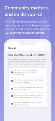 With our advanced moderation and reporting systems, we keep our app a kind and friendly place in the ruthless world, giving you all the control.