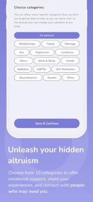 Choose from 15 categories to offer emotional support, share your experiences, and connect with people who may need you.