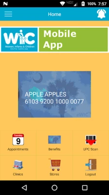 The South Carolina WIC Mobile App will give WIC participants the opportunity to view upcoming appointments, view food benefits that have been issued to them in the clinic, scan UPCs while shopping at the store to see if the UPC is a WIC Approved item or not, and provide information on locations of WIC Stores and WIC Clinics across the State of South Carolina.