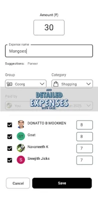 Add an unlimited number of expenses within each group. From groceries to concert tickets, record every spending detail effortlessly.