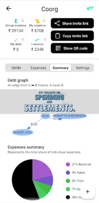 The debt graph provides a visual representation of debt obligations within the group. See who owes what and track settlements.