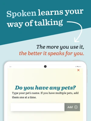 Spoken learns from your speech patterns, offering increasingly accurate next-word predictions as you use it to speak. A quick survey helps it tailor suggestions based on the people and places you talk about most.