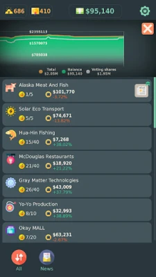 The game teaches you fundamental analysis and how to invest in shares. Events and news allows you to successfully trade shares. With all of the different real-world companies in the game you have a stable pattern of investing and receiving a passive dividend income from your idle factory, shop business and farm.