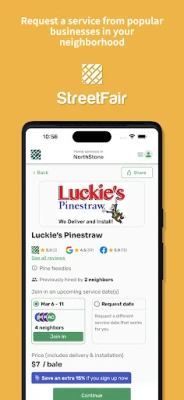 StreetFair is an online marketplace for neighborhoods that allows users to find and hire local home maintenance businesses based on who their neighbors already use and trust. Users can see the top local companies that do work in the neighborhood and join in on upcoming services already scheduled by their neighbors. As more neighbors sign up for the same service, the price goes down for everyone (group discount). Consumers get high quality services based on recommendations from their neighbors, Service Providers gain efficiency through route density (customers that live close together), and collectively neighborhoods can reduce traffic and lower their carbon footprint!