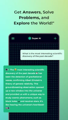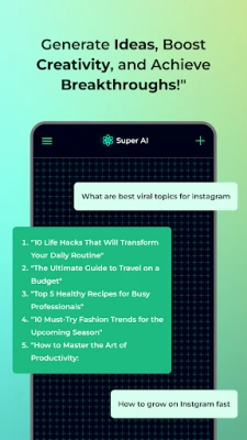Get instant and smart answers with Super AI chatbot, powered by ChatGPT 3.5 technology, providing interactive and fun conversations to make you more productive. So, whether you are a technology enthusiast, a professional, or looking for a personal AI assistant, Super AI is a helper to meet all your needs.