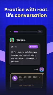 Miss Nova provides instant grammar corrections, pronunciation help, and personalized feedback. Whether you’re practicing conversations or working on tricky words, she’s always there to guide you.