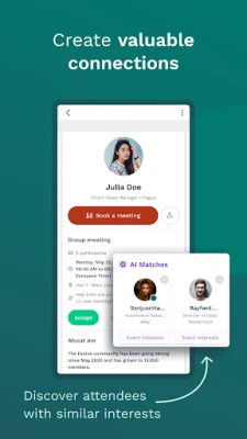 Swapcard’s AI suggests participants with common interests that match your professional needs. Review your matches, initiate conversations, and schedule in-person meetings directly in the app.