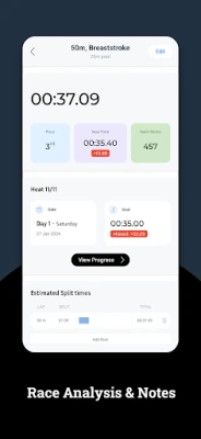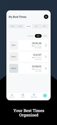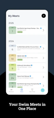 A useful tool for competitive swimmers to keep results and photos from swim competitions organised and in one place. Enter your strokes, distances and times achieved, add coach feedback, upload photos and much more. You can enter your swim meet info in advance and simply add your swim times later.