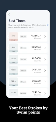 All your strokes and distances sorted by the highest number of Swimming points. This shows which stroke and distance combination is your strongest one.