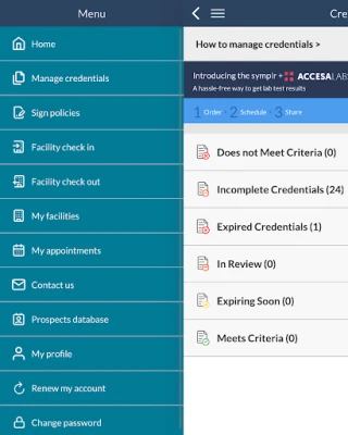 Manage your symplr account and get quick access to facilities with our mobile app. While on-site, a virtual badge will display that includes the vendor profile photo in addition to appointment details. Track your credentials on the go: you can easily see the status of your credentials and view detailed credential descriptions. While on-site, use the app to check in, view your appointments, display a virtual badge with your profile photo & appointment details, and check out.