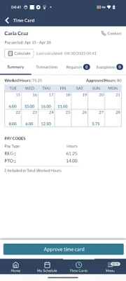 • View your employees' timecards, requests, exceptions, and contact information.