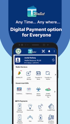 T Wallet, the official digital wallet by Government of Telangana, makes digital payments for both government and private services with ease. With T Wallet, one can do Money Transfer, Bank Transfer, Mobile Recharge, Metro Card Recharge, Electricity Bill Payment, Water Bill Payment, Property Tax Payment, Travel Tickets Booking, Online Recharges and other digital Bill Payments.