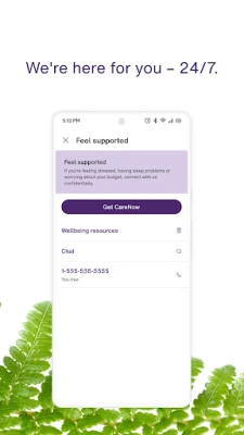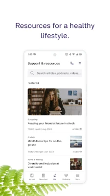 • Available on this app, TELUS Health EAP gives you access to 24/7 support for mental health care and for other areas of your personal and professional life, including legal and financial assistance, child and elder care, career services, nutrition services, and more.