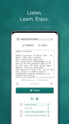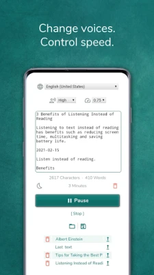 Features * Listening to text while phone is locked. * Change reading speed. * Change voices. * Choose any language that supported. * Share text with app using share button.