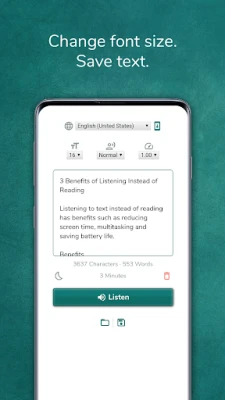 Benefits * Reduce screen time - give your eyes a rest. * Save battery life - listen to text when screen off. * Multitasking - While listening your eyes and hands are free for other tasks.