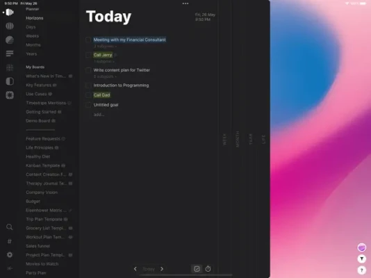 Expand your planning horizonsTimestripe is a unique planner with flexible time frames. Planning your daily, weekly, monthly, yearly and lifetime goals allows you to think strategically, have a clear vision, and focus on things that are really important to you. We call this planning system Horizons.