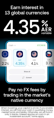 - High interest on your uninvested cash: 4.35% on GBP, 2.2% on EUR, 4.1% on USD, and more. Paid daily. Terms apply.