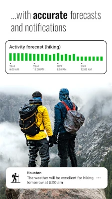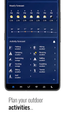 Plan your outdoor adventures with our unique Activities feature, which provides weather suitability for popular outdoor activities like hiking, running, camping, kayaking, fishing, and hunting for the next 48 hours.