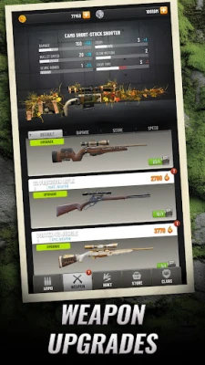 Weapons: Collect cards from duel Crates or leaderboard rewards to unlock and upgrade over 20 distinct firearms perfect for any sniper hunter battle. Each weapon features unique stats like Damage, Bullet Speed, Score Bonus, Zoom level, Slow Motion duration, and Zoom Time. Customize your shooting loadout to match your hunting style and dominate the battle games. Fine-tune your sniper gear!