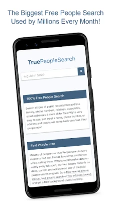Millions of people use True People Search every month to find lost friends & loved ones. With comprehensive data on nearly every US adult, our free people finder is as deep, current and accurate as any of the paid people search engines. Do a free reverse phone lookup, free people search or free address lookup and get a free background check instantly.