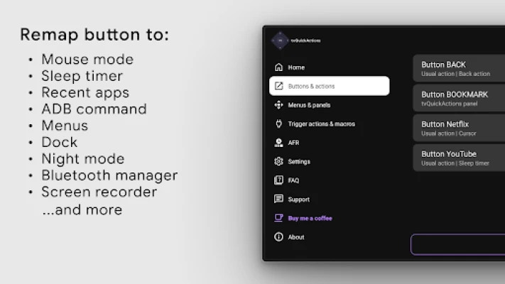 tvQuickActions is a button/key mapper developed specially for TV devices. Supports Android TV, Google TV and AOSP on most devices.