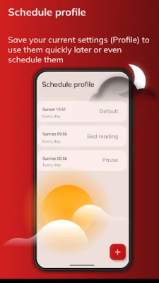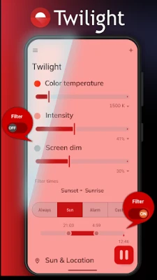 The Twilight app makes your device screen adapt to the time of the day. It filters the flux of blue light emitted by your phone or tablet after sunset and protects your eyes with a soft and pleasant red filter. The filter intensity is smoothly adjusted to the sun cycle based on your local sunset and sunrise times.