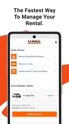 - Pick up and return your rental with just a few taps on your device, any time. - Sign in with your custom profile to skip the counter and reserve in minutes. - Get an instant quote, manage your order, and review your rental history. - Use the live chat feature or email us for 24/7 support. - View FAQs and resources to answer your questions. - Quickly find a U-Haul location near you with the products and services you need.