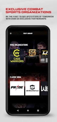 --Extensive Fight Library: Relive classic bouts and catch up on past UFC events, including full fight cards, individual fights, and exclusive behind-the-scenes content. Plus, a historical archive of non-UFC events from PRIDE, Strikeforce, WEC, and 50+ other combat sports organizations.