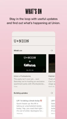 • Custom profile: Create your profile and get matching. Share your interests and hobbies and find in-common people in your building. • Find others: Discover other residents and get chatting. Forget the awkward convo starters with icebreakers on your common interests to get the chat flowing. • Book a social: Book out a clubroom for a takeaway night with friends or grab the snug for a movie marathon. • Building notice board: Stay in the loop with useful updates and find out what’s happening at Union. Receive updates and announcements straight to your phone.
