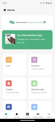 - Manage your account from anywhere and check-in with your virtual membership card - View our class schedule and changes - Add classes to your calendar - Stay up-to-date on announcements and events - Check-in on your social networks - Contact the Center with questions or for support - See what special offers are available