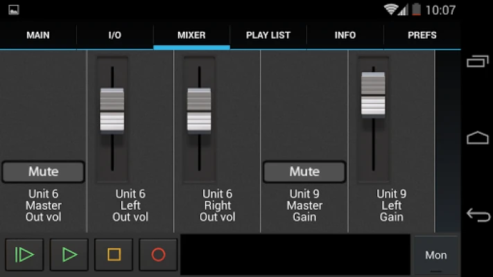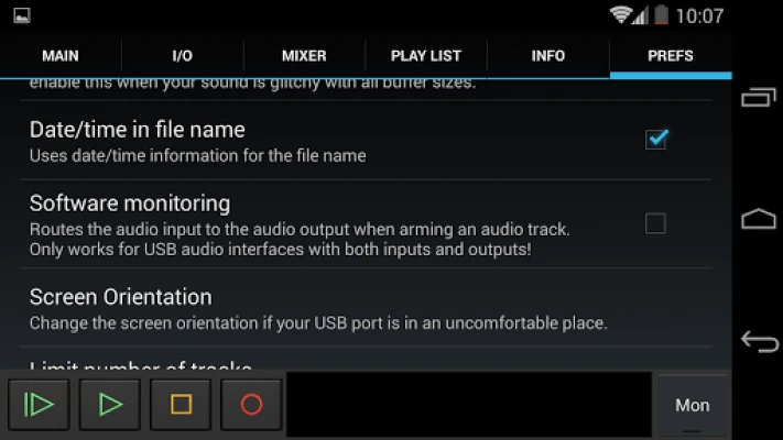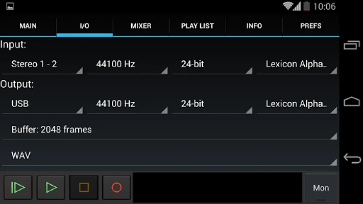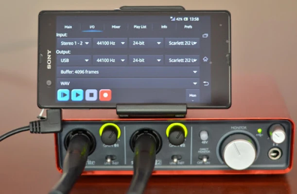 • Play through your Android device's internal speakers or headset in case you have an input-only device like an USB mic