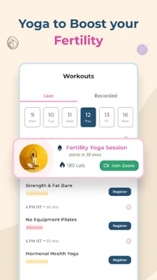 Yoga is an ancient Indian fitness practice that not only improves posture, flexibility or aids in weight management - it also improves blood circulation in the body & helps in hormonal balance. Through these benefits, yoga is extremely beneficial for fertility. Through our premium offering, try our live & interactive yoga sessions designed to boost female fertility & improve hormonal dysfunction. Also try our self-paced workout module to follow preconception fitness from anywhere, at anytime.