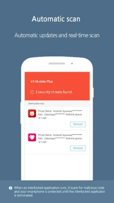 When you open an application interlocked with V3 Mobile Plus, the anti-virus engine will get updated to the latest version, and Real-Time Scan will scan your device for malware. When a malicious file is detected, you can remove it immediately.