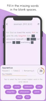 4. 🔏 Reveal Challenge: Test your memory with this unique tool where part of the verse is hidden, and you must tap the correct word from a list of possible answers. Choose from 3 difficulty levels.