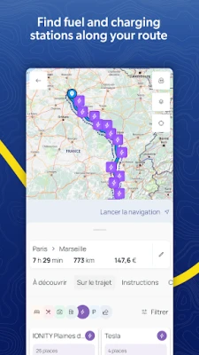 - Possibility to find the nearest gas station or electric charging stations around you, ideal in the preparation phase of your electric car trip.