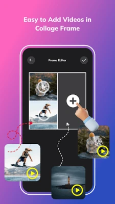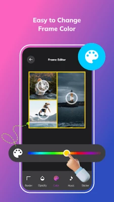 - Collage grid of 2, 3 and 4 frames - Use video from mobile gallery and create video acourding to frame selection. - Frame Border color change using color picker. - Border thickness set as per user conveniency. - Add your own music using collection of your device or keep the actual video sound. - Amazing sticker collection provided to create attractive video collage. - Change the opacity of border for effects. - Easy to save and share video to others.