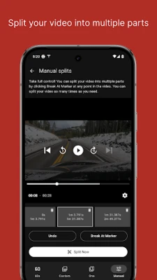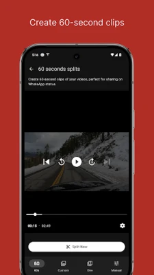 - Completely free without any ads and no user data is collected. - Split your videos seamlessly into 60 seconds or custom splits for WhatsApp and other social media platforms. - Split videos into custom duration clips according to your preference. - Extract one clip from the video based on your desired start and end times. - Manual mode to split videos at desired positions. - Easy to select single or multiple videos from library and share them. - Mesmerizing Dark and Light themes. - Modern "Material You" themes for a fresh look All product and company names are trademarks™ or registered® trademarks of their respective holders. Use of them does not imply any affiliation with or endorsement by them.