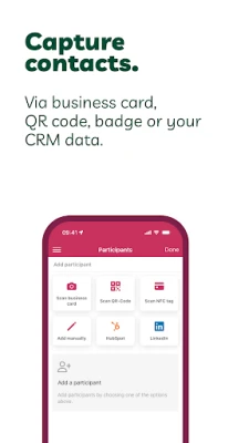 Capture leads in real time — at trade shows, during meetings or in the field. VisitReport by snapAddy digitizes your contact capturing process, letting you scan business cards, QR codes, trade show badges, NFC tags or CRM templates — all saved cleanly to your CRM.
