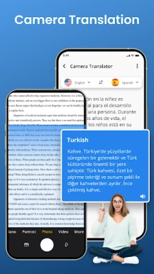 Voice Translator AI Translate enables seamless conversations across multiple languages with real-time speech conversion. Language Translator offers smooth text and voice translation, ensuring that you can communicate effortlessly worldwide. With Camera Translator, simply point your camera at text in images, signs, or menus to get instant translations. The AI Photo Translator enhances accuracy by recognizing and converting text from images using advanced artificial intelligence. The Voice Translation App supports both text and audio translations, making communication more accessible and convenient.
