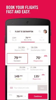 Book your flights more simply and easily from your mobile. During the booking process, you can access your recent searches, go forward and back at any time, and access our best tariffs and exclusive offers from the Megavolotea subscription service too. You’ll also be able to access all extra services and view the breakdown of your flight price, including all the details.