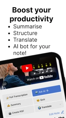 Instant Content Creation: Turn your transcriptions into well-formatted summaries, engaging social media posts, and detailed notes. Create professional-quality content with just a few taps, enhancing your productivity and content efficiency.