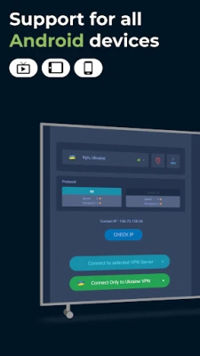 + As a matter of convenience, there are two separate connection buttons. The 1st instantly connects to a Ukrainian VPN, while the 2nd establishes connection to a VPN selected from the list. It's as easy as pie. If you need to unblock certain websites, just select a server in another country and connect to it. If you need to get a Ukrainian IP, connect to a VPN server in Ukraine at the click of a button.
