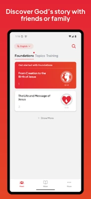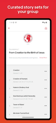 Features: - Available in multiple languages - Download lessons for offline use - Easily share bible stories (both text or audio) - Envision and mobilize other believers to make disciples
