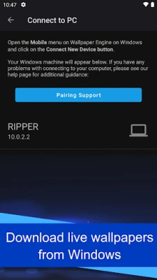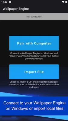 The Wallpaper Engine mobile companion app allows you to import your live wallpaper collection onto your Android device with ease. Connect to Wallpaper Engine on Windows and transfer your existing live wallpaper collection to the mobile app or import local videos and GIFs and use them as live wallpapers with ease!