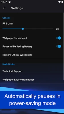 • Supports videos, GIFs and interactive 2D / 3D scenes as wallpapers. • Connect to Wallpaper Engine on Windows to transfer your desktop library onto your phone. • Allows you to customize the look and feel of your wallpapers. • You can set up a playlist that automatically cycles your wallpapers in regular intervals or depending on the time of day. • Wallpapers automatically pause when power savings mode is activated on your phone. • The app is completely ad-free and also does not track your behavior.