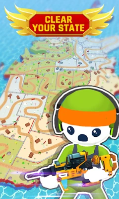 Once the track ends, take your evolved weapon into a free-play combat zone. Control your character to eliminate enemies and capture states. Dominate the battlefield and watch your progress on the map, showing captured territories and those still awaiting your conquest.